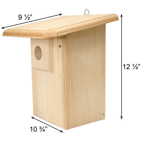 Add a lasting shelter for bluebirds west of the Rocky Mountains with this Coveside Western Bluebird House with Extra Large Roof. These birds, ranging from Canada to Mexico, tend to prefer larger homes than their eastern counterparts, and this sizable pine unit perfectly meets this need. Its generous, oversized roof keeps the interior chamber protected from rain and snow, as its slightly curved edges and extra lip direct precipitation away from the roost. A 1.5625" diameter opening surrounded by a wooden predator guard allows mountain and western bluebirds to enter the home while deterring mammals from reaching in and stealing eggs. Fledglings can readily reach the exit to leave the nest box when ready thanks to a ladder on the inside of the front panel, and gaps in each base corner ensure the cavity remains dry. Additional gaps below the large roof overhang offer ventilation, furthered by the 0.75" thick pine boards and their light coloration. Over time, these sustainably sourced panels will age to a striking gray hue, and an attached back hanger makes placement on a post, tree, or wall simple. Use a mounting bracket (not included) on the base for a different display option, and lift one latched side panel to perform nest checks and periodic maintenance. Place this Western Bluebird House with Extra Large Roof to your bird garden for a bold and classic domicile for select songbirds. Some assembly required. Made in the USA.