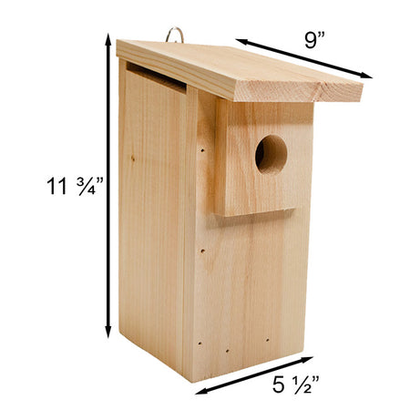 Help a child appreciate both birds and construction with this Coveside Eastern Bluebird House DIY Kit. This bundle of precut pine panels and hardware makes it easy to build an appropriately sized shelter, offering a roosting spot to lovely, scarce bluebirds. These birds readily nest in manmade homes, as habitat loss has made it difficult for them to find suitable shelter, and this striking unit provides a fantastic roosting option. The 6 precut, pine boards combine together easily using the included hardware and straightforward instructions, and the 0.75” thick wood keeps this nesting area nicely insulated. Gaps below the roof line ventilate the shelter, while the soft yellow color of the wooden body prevents nestlings from overheating. A 1.5” diameter entry allows bluebirds to readily enter the domicile, and a wooden block around this opening acts as a barrier against predators reaching into the cavity. The downward sloping roof directs water away from the nesting cavity, while gaps in the corners of the base allow any captured rain to drain. A metal latch allows one side panel to swing upward for nest checks and maintenance, and an included metal hanger affixes readily to the back of the home for placement against a wall or fence line. The kit needs only a hammer and Phillips head screwdriver for assembly, perfect for a project with you and your child, and will certainly add a timeless hint to your backyard bird sanctuary. Cement a love of wildlife and craftsmanship in your child with this Eastern Bluebird House DIY Kit. Assembly required. Made in the USA.