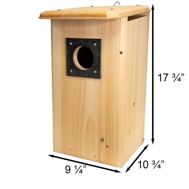 Provide northern flickers a lasting shelter designed to specifically meet their needs when you place this Coveside Flicker House in your bird garden. These common woodpeckers readily utilize manmade bird houses, and this durable pine option wonderfully creates a quaint respite for these feathered friends. The 2.5" diameter entry hole allows these birds access to the deep chamber, while its slate guard is made from authentic, century-old roofing material from the northeast, giving you a unique feature to prevent other woodpeckers from enlarging the entryway. A downward slanted roof sports a generous overhang to add protection against unwanted weather conditions, and rounded edges on the roof keep water from dripping into the shelter. Gaps in the corners of the natural, pine base provide additional drainage to ensure that the home's inhabitants remain comfortable and dry. An included bag of wood chips simulates the natural roosting activities of these flickers, providing a useful accessory as you help them establish a reliable habitat. The 0.75" thick pine boards insulate the domicile, and ventilation slots just under the sides of the roof keep the internal temperature well regulated for optimal comfort. A single side panel lifts upward for periodic nest checks or seasonal cleanings, and the unembellished pine body will age to a striking gray for a striking and varied look among your landscaping. A metal loop hanger on the rear panel of the nest box encourages you to place it against your wall or fence line, or you may add a mounting bracket (not included) to handsomely display the home on a pole or post. The robust construction of this handy abode gives you a wonderful dwelling that will remain vibrant in your bird sanctuary for many seasons of service, inviting new birds to peacefully nest in your area. Beautify your garden and attract activity and entertainment from feathered friends with this Flicker House. Made in the USA.