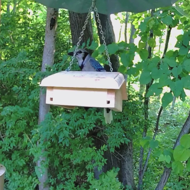 Allow chickadees, woodpeckers, and titmice to enjoy a tasty treat in your garden without fear of larger birds spoiling the fun with this Coveside Hanging Upside-Down Suet Feeder. This assortment of clinging birds will be able to easily grip the 0.5" square mesh on the underside of the feeder to access a nutritional suet feast. This durable, pine feeder's clever design restricts unwanted pests and larger, non clinging birds such as starlings and blue jays from raiding the food offering and taking it for themselves, allowing your smaller feathered friends a chance to gorge in peace. A helpful, pitched roof protects the feed from rain, while the reliable pine construction lends ample durability and quality to give birds a reliable dining experience. To place suet inside the unit, simply slide out the mesh panel to refill it, or you can give it a thorough cleaning when open to make sure avians get their snack in a proper and hygenic fashion. This handy, compact unit's natural pine is sourced from a family owned lumber mill using sustainable forestry practices and will weather to a handsome, gray look with exposure to outdoor elements and over time, and the included chain link hanger makes it simple to place on a hook. Let diminutive birds enjoy a fantastic suet snack in peace by placing the intuitive Hanging Upside-Down Suet Feeder in your backyard haven. Made in the USA.