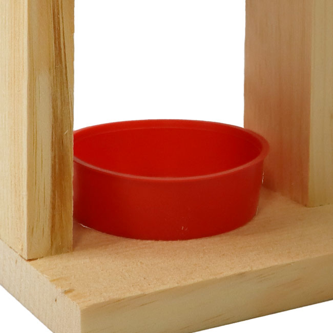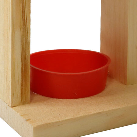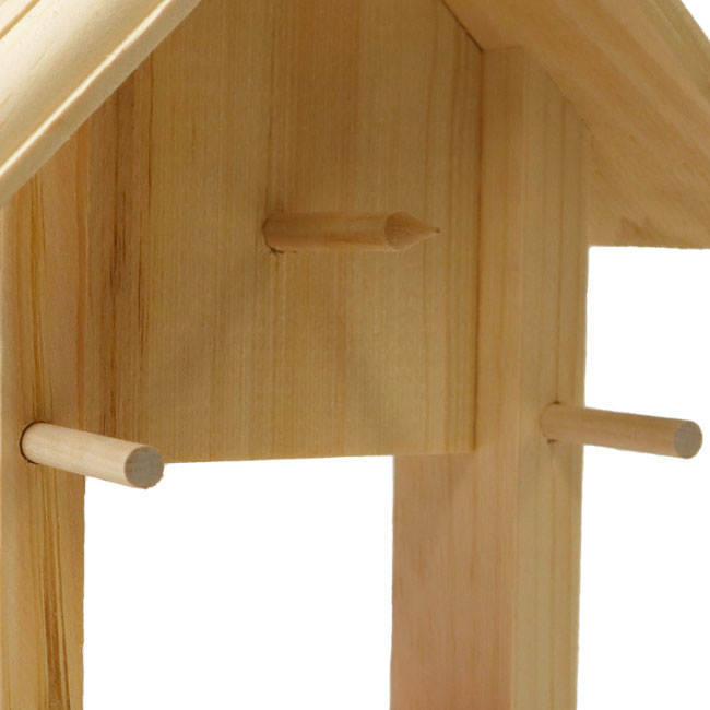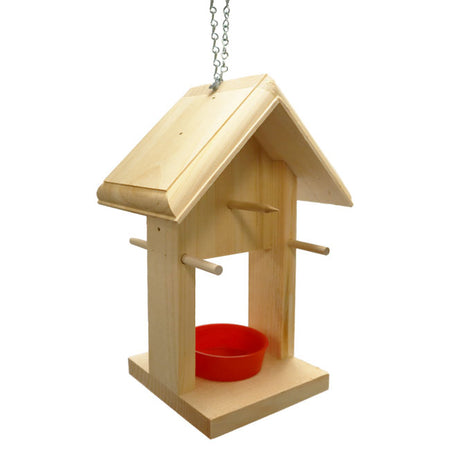 Offer a bevy of different dining options to different types of birds by showcasing this Coveside Jelly, Fruit, and Mealworm Feeder in your bird garden. This durable and naturally beautiful unit is sourced from family owned and sustainably forested pine for a quality, standout item, and its fly-through design beckons birds to dine comfortably in your yard. A removable, red plastic feeding tray rests in the middle of the unit's platform, firmly secured for reliable use as a wealth of various bird species visit and feast. Tropical birds subsist on fruit during winter months and seek out sweet treats when visiting northern areas. This handy receptacle is ideal for placing dried or sliced fruit, mealworms, or sugar water to attract bluebirds, orioles, and a multitude of other species. For a different option, fill the receptacle with a third of a cup of jelly for an additional sweet offering. Ample skewers on both sides of the feeder lend a perfect spot to add more fruit to each side, rounding out a robust smorgasbord for birds seeking these flavors. A pair of perches are situated on either side of both skewers, offering a wealth of resting spots while feasting, and the pitched roof provides coverage and protection from outdoor elements for a pleasant dining experience. Resting at the top of the unit is a chain hanging loop to allow an easy showcase as you place this handy feeder on a hook or branch in your garden. Over time and exposure to weather, this natural pine complexion will weather to a gray tone for a varied and arresting look, lending further appeal and charm to this durable item. Bring birds of all kinds to your backyard sanctuary when you display the fantastic Jelly, Fruit, and Mealworm Feeder. Made in the USA.