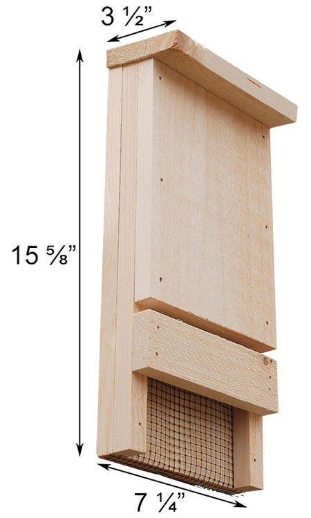Create a striking bat haven in your yard with the Coveside Mini Bat House. This home makes a perfect beginner bat house, and also provides a wonderful option for seasoned landlords who wish to add to their existing bat colony. The 0.75" deep, single chamber houses up to a dozen bats, and the rough interior with black screening offers several convenient places for them to cling and rest. A 0.5" thick echolocation slot on the house's front helps bats easily return to the roost, while the roof's subtle overhang protects the interior from rain. Solid, eastern white pine construction makes this a lasting and natural home, which will age to a lovely silver color with exposure to the elements. Use the attached metal hanger to mount this attractive home to a pole, post, or building. Add on to your bat haven with this attractive Mini Bat House. Made in the USA.