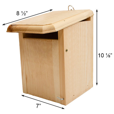 Attract interesting and musical bluebirds to your outdoor space while discouraging unwanted sparrow activity with this Coveside Sparrow-Resistant Western Bluebird House. The innovative design of this nest box effectively deters sparrows from roosting, while providing Western bluebirds, known for their blue chins and necks, an ideal housing choice. Research from the University of Kentucky shows that bluebirds will readily utilize a slot entry, while sparrows prefer a round hole. The 5.25" long and 1.25" high entry on this shelter perfectly meets these needs, and a generous, overhanging roof protects the interior from precipitation. Use the included, 1.5" thick, pine block at the base of the home to decrease its depth, as this same research shows that bluebirds will still populate the box, while sparrows seek out a deeper nest. Angled corners just below the roof keep this home well ventilated and assist in regulating its internal temperature, aided by the 0.75" thick, all pine construction. Pull the front panel of this home upward for nest checks and to add the wooden block for less depth if needed. A metal latch keeps the home securely closed, and the rough interior of the item helps nestlings grip it and climb out. The pine panels come together to formulate a superior, trusty nest box, and this staunch unit will offer many seasons of service to these charming songbirds. Over time and with exposure to the elements, the natural tone of this lovely item will weather to a charming gray for a dynamic and arresting look. Use the attached, back hanger to situate this convenient home against a wall or post, or pole mount it with a mounting bracket (not included). Discourage sparrows from overtaking your bluebird sanctuary with the help of this Sparrow-Resistant Western Bluebird House. Made in the USA.