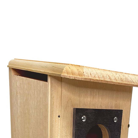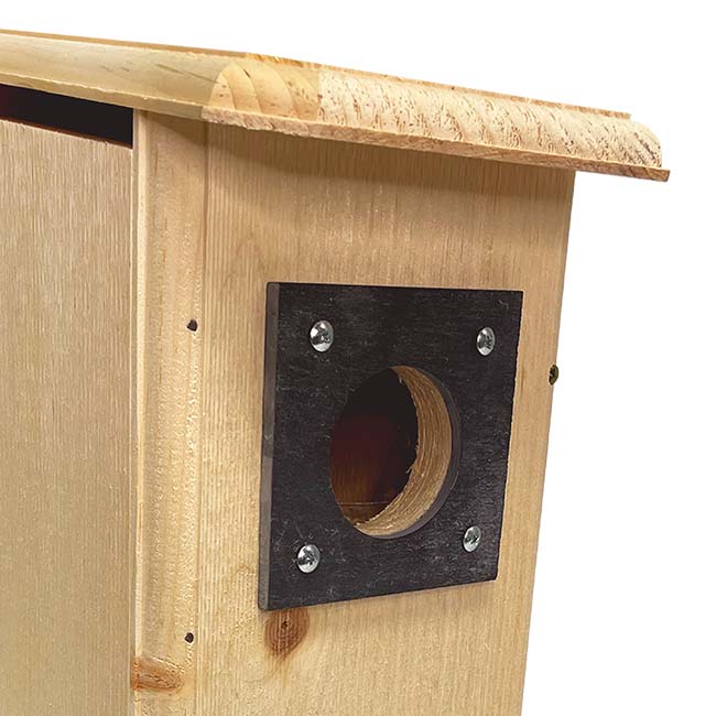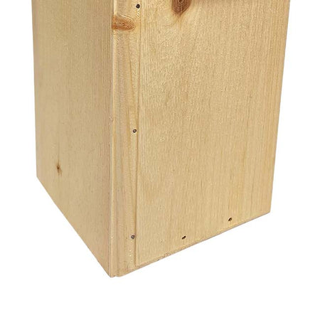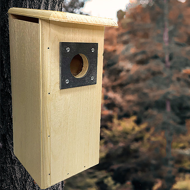 Give your clients a fantastic way to provide woodpeckers a lasting home in their birding sanctuaries with this 4 Pack of Coveside Three Woodpecker Houses. These elusive birds are known for being cavity nesters, and will readily roost in manmade homes, making this pack a fantastic option for your birding patrons. The classic, all pine abode is perfectly sized for red-headed, hairy, or red-bellied woodpeckers, with each unit's deep body and 2.25" diameter entry accommodating all three. Each abode's slate is sourced from old eastern architecture and repurposed from recut roofing tiles to guard the entry hole and prevent birds from enlarging it. A downward slanting roof overhangs each home for a dry nest, and extra gaps in the corners of the base facilitate fresh drainage to give these birds a clean living space. One side panel swings upward to let patrons clean the roost with ease, and the natural, yellowish hue and top gaps keep nestlings from overheating. Woodpeckers regularly excavate cavities in decaying trees, and these nest boxes include a generous bag of wood shavings to help patrons better attract these birds while encouraging their natural tendencies. A metal hanger on the back aids in mounting each home, while the roughened interior of the roost aids nestlings in reaching the exit when ready. Help foster the woodpecker harboring efforts of your clientele with these 4 Three Woodpecker Houses. Made in the USA.