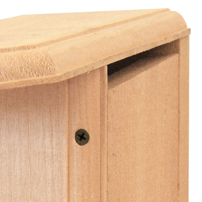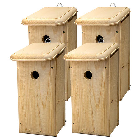 Offer your loyal clientele a handy way to attract an abundance of musical and acrobatic chickadees to their birding stations with this 4 Pack of Coveside Chickadee Houses. Active chickadees hop from tree to tree as they forage for insects, and this robust assortment gives your clientele plenty of space to host these delightful birds. Each of these beautiful, sustainably sourced dwellings are made of old eastern pine for unique, hardy charm, and the 1.125" diameter entryway allows easy access to these familiar feathered friends. A downward slanting roof protects each home from rain and other outdoor conditions, with slots situated at the sides of the top panel for superior ventilation. Each home's rough hewn interior helps young fledglings climb out when it's time for evacuating the nests, while gaps at the corners of each base help with consistent drainage for a dry interior. A single side panel on each house lifts open to let your customers carry out simple maintenance and cleaning tasks, and the natural pine gradually turns to a beautiful gray tone with repeated and consistent exposure to the elements. Each unit has a metallic loop hanger and predrilled hole on the back panel, letting clients easily mount the homes to a post or tree in their yard for a simple showcase. Give your loyal patrons a collection of handy homes to populate their birding stations with when you offer this 4 Pack of Chickadee Houses. Made in the USA.