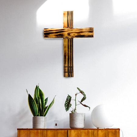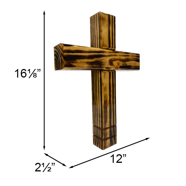 Showcase your faith with fervor and passion by displaying this splendid Distressed Rustic Wooden Cross by Prime Retreat against your wall. This astounding, robust piece will wonderfully represent your everlasting faith in bold and brilliant fashion, as well as your commitment to the earth. Made from repurposed wood, two pieces interlock thanks to specifically carved notches, creating a familiar cross shape. The segments are flamed with a torch to give them a stunning and varied appearance, and then covered with a clear coating for longevity. Deep brown hues run through the lighter tan tone, providing a striking and beautiful contrast while this piece adorns your personal space as a staunch beacon of your belief. With a generous 12” width and 16.125” height, this symbol will command attention as it graces your living area, serving to emblazon your faith in lovely style. Use the included pair of screws to easily connect the two separate pieces of this item and utilize the optional picture hanger to allow for easy wall placement of this durable, steadfast emblem of your devotion. Demonstrate the depth and grandeur of your personal faith with this Distressed Rustic Wooden Cross. Some assembly required. Made in the USA.