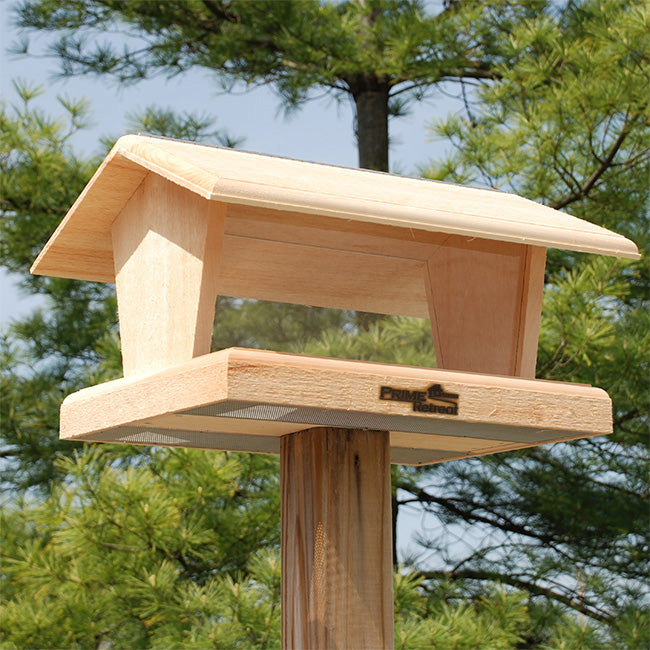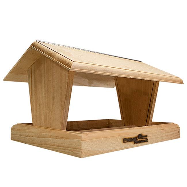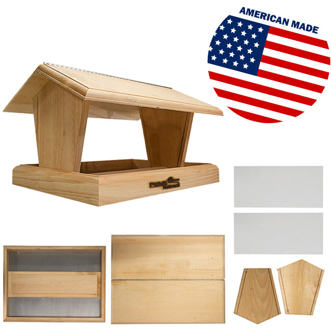 Undertake a quaint and rustic project in your bird garden while offering a substantial feeding station to your backyard birds with this amazing DIY Large Hopper Feeder by Prime Retreat. This significant feeder accommodates a generous amount of nutritional seed to feed an array of feathered friends, and its large platform allows several to feast at once. Precut pine and plexiglass panels help you easily construct a staunch and robust frame, with the pair of clear panels in the middle of the unit creating the item's feeding reservoir. The hopper can hold a plentiful 9.5 quarts of mixed seed, cracked corn, or peanut chunks, allowing you to sustain a bevy of hungry birds while cutting down on the frequency of refills. Feed levels are simple to monitor via the clear plexiglass panels, and the wood surrounding the item's base sets up an ample, convenient feasting platform. Metal screening on the feeder's base ensures adequate drainage to prevent a spoiled treat, while the pitched roof overhangs all sides of this expansive feeder to protect seed and feathered friends from rain. A hinge on the roof's top lets you lift one side easily upward to perform refills and regular cleanings, while a wooden seed diverter in the center of the reservoir angles slightly downward on both sides to helpfully distribute the feed to either side, eliminating unwanted accumulation. For a lofty, striking showcase in the bird garden, attach a mounting bracket (not included) to the base of this hardy unit. This simple project provides relaxing enjoyment in your outdoor space, and repeated exposure to outdoor elements over time will weather the feeder to a lovely and charming gray tone, offering dynamic allure in your bird sanctuary. Complete a fun and relaxing project and add a beautiful accessory to your bird haven with this sizable and magnificent DIY Large Hopper Feeder. Assembly required. Made in the USA.