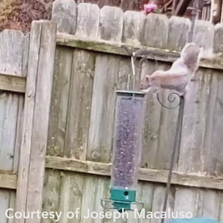Confound squirrels and offer seed to several birds with this Droll Yankees Yankee Flipper Squirrel Proof Bird Feeder. This fantastically popular feeder perfectly holds plenty of mixed seed for your feathered friends. The lengthy, UV stabilized reservoir holds 3.33 quarts of mixed seed, with 4 ports and a perch ring at its base. This ring reacts dramatically to the weight of a gray squirrel, providing you hours of outdoor entertainment. Once a large squirrel or bird puts its full weight on the perch, an internal motor spins it, flipping the animal off of the feeder. The hardy, die cast metal construction of this base and perch ring matches that of the cap, and the deep green, powder coated finish adds longevity. The snug cap keeps the seed protected from rain, and the powerstick inside the reservoir acts as a diverter, directing feed to the ports. The extra long feeding tube also prevents squirrels from hanging on the lid and grabbing seed, and the clear polycarbonate body keeps feed levels visible. An on/off switch at the base of the unit allows you to operate it only when desired, and an included AC adapter makes recharging the mechanism simple. This multitude of features has made the Yankee Flipper a classic, durable, and favorite addition to bird gardens everywhere. A robust looped, stainless steel top wire makes hanging the piece simple, offering stability and security. Discourage squirrels from dining while adding some fun to your backyard with the Yankee Flipper Squirrel Proof Bird Feeder. Two year limited warranty on feeder. One year limited warranty on motor and battery.