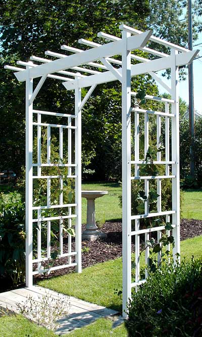 Dura-Trel arbors are constructed of the highest quality vinyl, which contains the greatest concentration of Titanium Dioxide available. Titanium Dioxide is a powerful UV stabilizer that protects the vinyl from the harmful ultraviolet rays of the sun. This arbor will never fade, crack, peel, or rot and there is no need to paint it. Assembly required. Made in the USA. Twenty year guarantee.