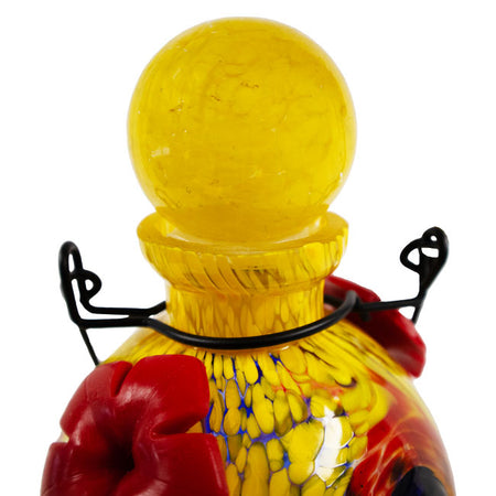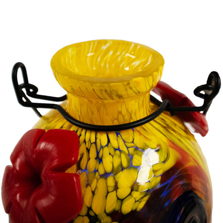 - A red glass band loosely divides the cobalt blue and yellow sections on the vessel.