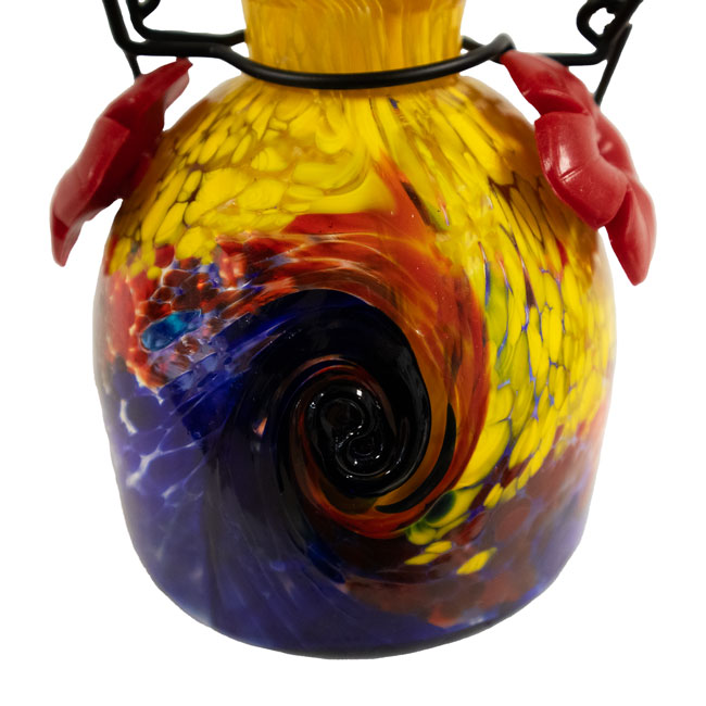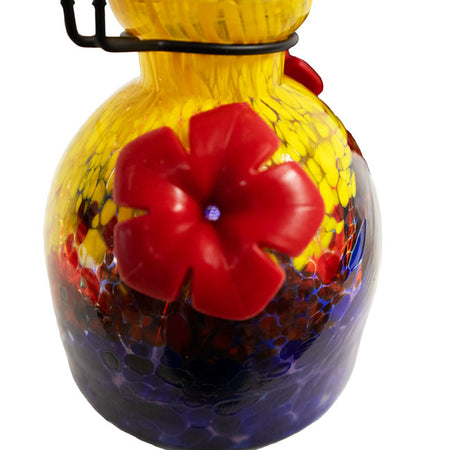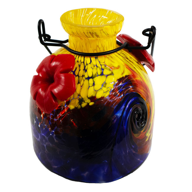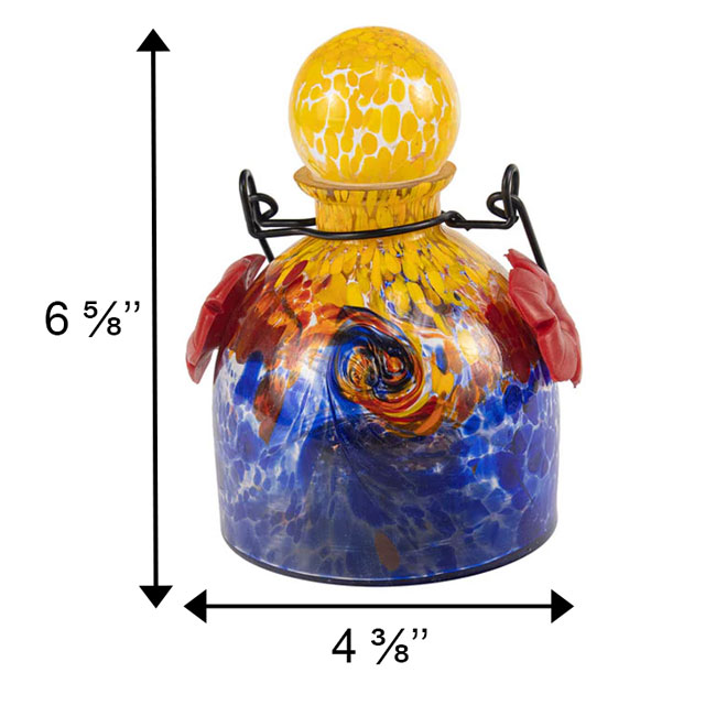 - Blown glass, bell shaped hummingbird feeder with integrated solar light adds striking shape and vivid color to your outdoor decor.