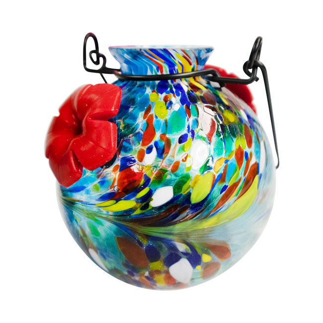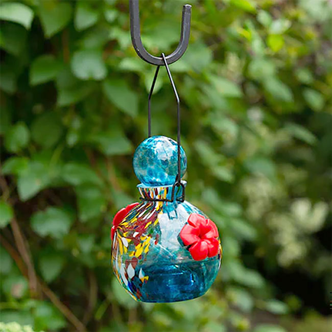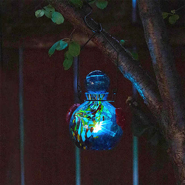 - Blown glass hummingbird feeder with integrated solar light brings an elegant and colorful accent to your outdoor look.