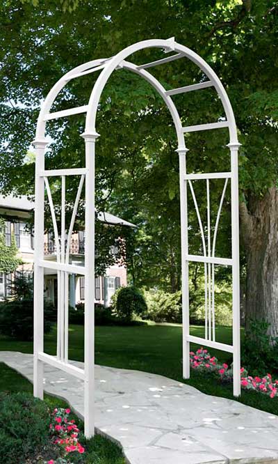Add a touch of Ireland to your garden using the Eden Dublin Arbor. This exciting accessory brings curves and height to your setting in moments. The side panels each hold a fan shape for a bit of detail, leading to a classic arch at the top. Horizontal rods support this tall arch, with a cap in the center lending interest to it. Additional horizontal rods along the side panels support the fan shape and create places for you to grow ivy or other climbing plants, if desired. The white color on the unit enhances your flowers, while the vinyl construction requires little to no maintenance. Use the included ground anchors to keep this item secure in your lawn. Span a walkway or adorn your garden using this Dublin Arbor. Twenty year warranty. Assembly required.