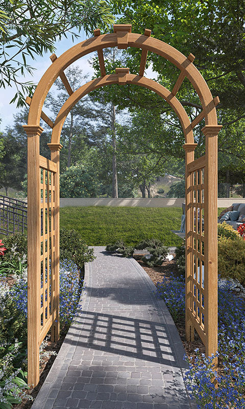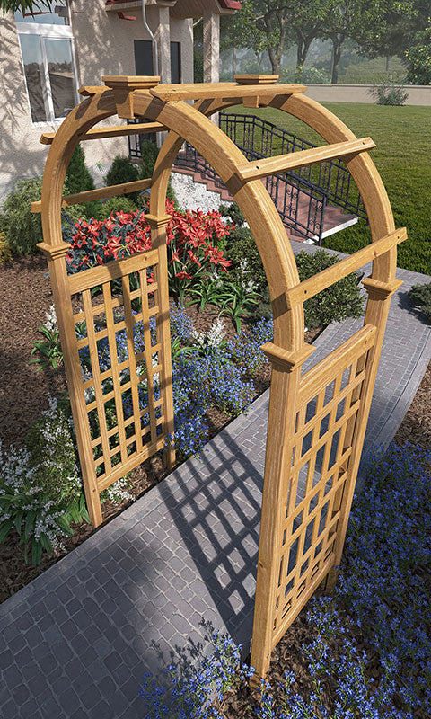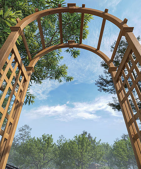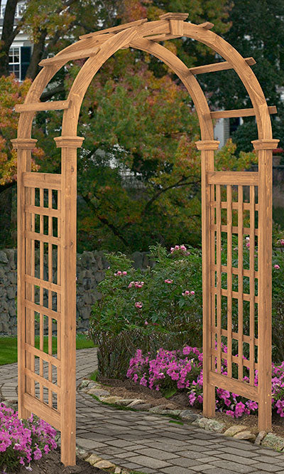 Fashion a remarkable and stylish entry to your garden using the Eden Rosewood Arbor. Placing an arbor to span a walkway or create an entrance brings structure and design to your garden easily. The lovely arch and rectangular lattice of this arbor create a classic look, enhanced by the cedar construction. The soft brown and red colors of the wood perfectly mesh with your garden, furthering the natural feel of the area. For added excitement and drama, plant vines at the base of the arbor and weave the tendrils in and out of the rectangular side panels as they grow upward. Four included ground stakes attach to the base of this unit, allowing the item to sink slightly into soil for added stability and strength. The piece assembles easily, and its cedar construction resists rot and insects. Create a classic and delightful look in your garden using this Rosewood Arbor. Assembly required. One year warranty.