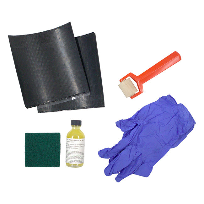 - Package includes two 6" x 6" squares of EPDM liner, a small bottle of QuickPrime adhesive, a scrubber pad, a roller, and a pair of disposable gloves.