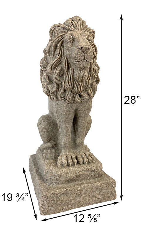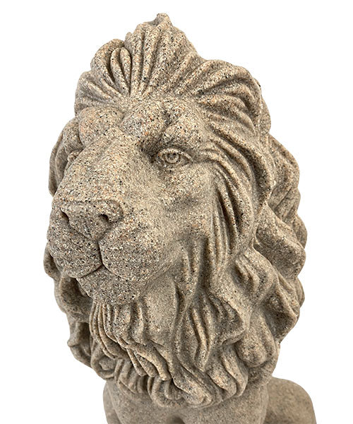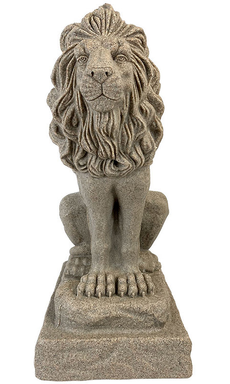 Enhance your landscaping or garden with a striking sentry by placing this Emsco Sandstone Colored Guardian Lion Statue in it. A straightforward gaze, upright position, and extended claws on this lion figurine create an intent effect, fantastically protecting your porch or garden for many seasons. Amazing detailing throughout the lion's face, mane, and body lends a realistic hint to the item, while its stepped base adds height. A variety of light and dark brown hues throughout the unit evoke sandstone, enhanced by the slightly uneven edges on the base. This rectangular platform is simple to place on a level surface, and a plug on the bottom of the unit removes for filling it with gravel or sand. This provides extra heft and stability to the figure, while its resin remains beautiful throughout most weather conditions. The significant size of the statue makes it easy to showcase in a variety of settings, and the sandstone-like finish furthers the robust effect. Place a classic defender in your landscaping using this Sandstone Colored Guardian Lion Statue. Made in the USA.