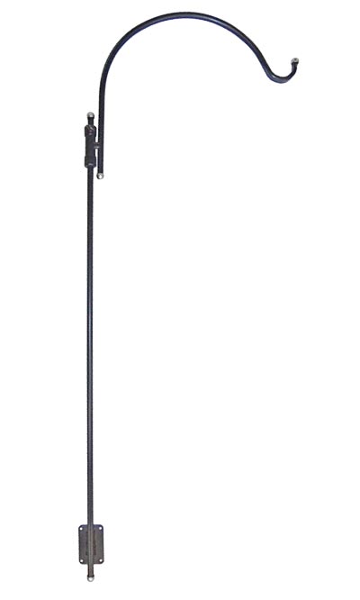 Add a bird feeder or hanging spinner to your deck using this Erva Black Adjustable Deck Hook. The black finish, platinum colored caps, and sleek design make this versatile unit a fantastic addition to your deck. The center, round steel shaft reaches 36" in height, and a rectangular plate on its base makes it simple to attach to your wooden post. A steel sleeve on this shaft supports the sturdy, arched hanger, which extends 14" outward and culminates in an upward curl. This arm not only slides up and down the shaft, it may also be swung inward or outward to face a different direction or for easy maintenance of your bird feeder. A thumbscrew on this adapter keeps the arm securely in place, and ensures you have a custom and perfect viewing spot for your adornment. The automotive grade, black powder coated finish keeps this item looking lovely even after exposure to the elements, and the platinum toned caps on each piece bring fun contrast to your garden. Use the four included wood screws to affix the base plate to your wooden deck post in moments. Enhance your deck with a hanging display using this Black Adjustable Deck Hook. Made in the USA.