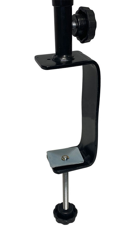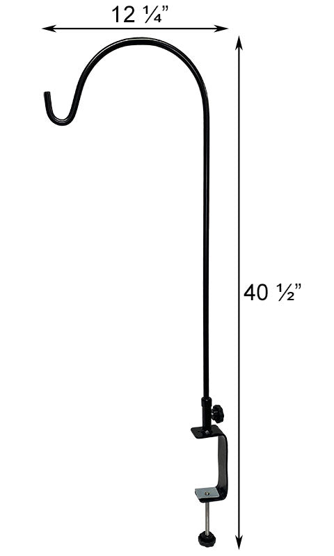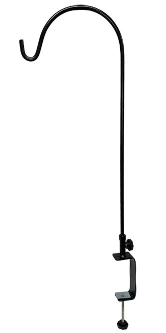 Suspend a bird feeder or small spinner from your wide deck using this Erva Black Deck Rail Hanger with Extra Large Clamp. The significant clamp on this classic hanger is specifically designed for use with more robust deck rails, between 2" and 5.625" thick. A large thumbscrew and plate make it easy to tighten this clamp onto your deck rail, and the hanger arm juts straight upward for plenty of display area. A top arch and upward curl holds your 22" diameter or smaller birdhouse or hanging basket, and the steel construction offers strength. An additional thumbscrew at the base of this shaft allows you to swing the arm inward and maintain your flowers or feeder in moments. It also offers versatility in showcasing your outdoor adornment, ensuring your wind chimes or suncatcher remains in the right position for optimal enjoyment. A black, powder coated polyurethane finish covers the all steel shaft, creating a durable item and classic look easily. Bring hanging outdoor décor to your wide deck rail using this Black Deck Rail Hanger with Extra Large Clamp. Made in the USA.