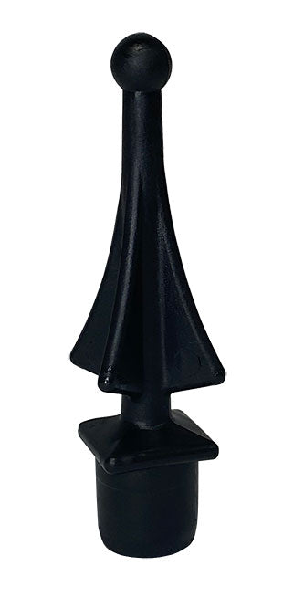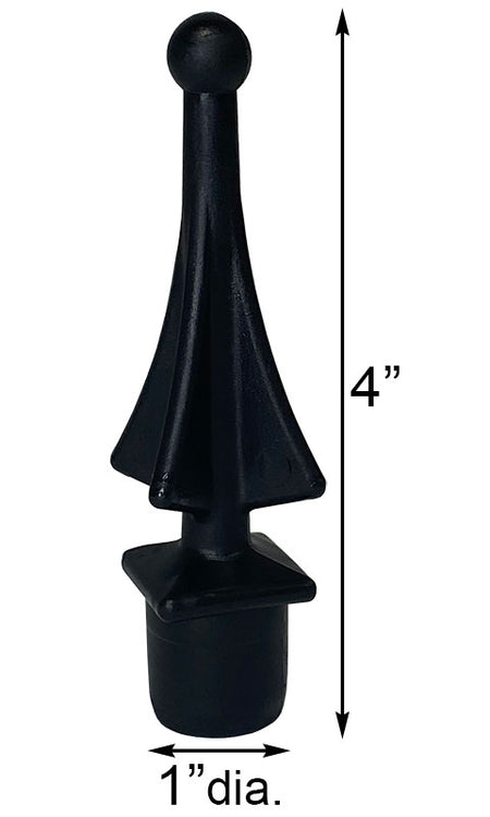 Elegantly top your open birding pole with this Erva Black Decorative Finial for 1" Outer Diameter Poles. This black, molded plastic topper wonderfully completes a tubular, 1" outer diameter pole, adding a finishing touch and small amount of height to it. Its bottom cylinder slides easily into your tubular pole, and the square section above it acts as a lip for a watertight seal. Four arrow shaped fins extend upward, and a small orb completes the topper. Its black tone meshes with most birding poles, and the plastic body will not rust for longevity. Add a classic cover to an open topped birding pole with this Black Decorative Finial for 1" Outer Diameter Poles. Made in the USA.