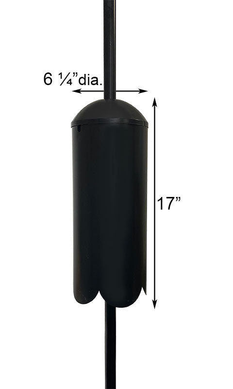 Protect your pole mounted bird feeder from marauding squirrels by adding this Erva Black Domed Top Pole Mounted Squirrel Baffle to it. Using a baffle on an existing pole creates a lasting, physical barrier, and the patented features on this unit form a great deflector. Its domed top with 2" diameter opening slides onto a variety of straight poles, and the shape keeps squirrels from grabbing an edge. A unique, scalloped base also stops them from getting a foothold, and the galvanized steel construction prevents them from chewing on it. An included collar slides onto poles with a 0.5" to 1.75" outer diameter, and the deflector rests on this ring, tilting if a large animal puts its weight on one side. The black, powder coated finish and galvanized steel body create a durable baffle, remaining hardy and lovely for use again and again. Protect a pole mounted bird house or feeder from climbing squirrels with this Black Domed Top Pole Mounted Squirrel Baffle. Made in the USA.