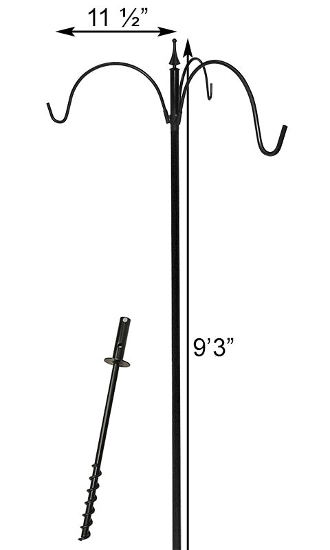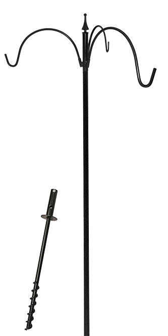 Showcase three bird feeders at once from this Erva Black Five Piece Birding Pole Kit with Triple Hanger. The black color, arched arms, and finial top of this unit add a classic look to your garden, while providing plenty of hanging spots in one area. The three sections of this 1" diameter, tubular steel pole attach together easily thanks to their swaged ends, and an included, 26" long auger ensures stability in the garden. The extended neck of this socket holds the pole in place with a large bolt, and a finial at the top of the pole completes the piece. Three angled brackets on this top section accommodate the included hangers, and the arched shape and upward curl of each arm enhance their classic appeal. The black, powder coated finish keeps the pole looking beautiful for several seasons, while the steel construction provides lasting strength. Place three of your favorite hanging adornments in one place with this Black Five Piece Birding Pole Kit with Triple Hanger. Assembly required. Made in the USA.