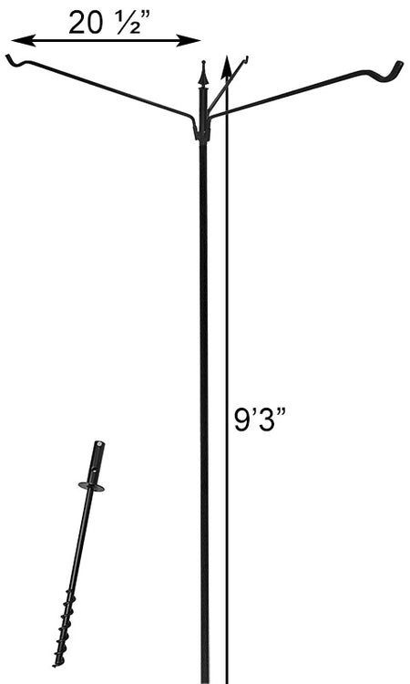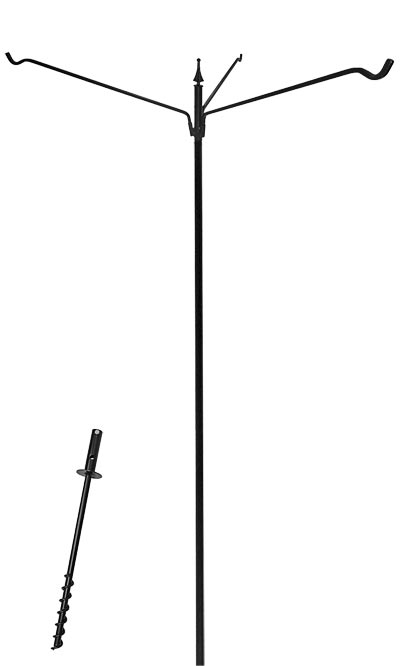 Place three of your favorite hanging items in one convenient viewing spot using this Erva Black Five Piece Pole Kit with Extended Arms. The generous size, robust steel construction, and classic design of this kit create an ideal way to display hanging items in a yard where space is limited. The three sections of the 1" diameter, tubular steel pole attach together easily with swaged ends, and an included, 26" long auger keeps it stable in the soil. The pole base slides into this socket perfectly, secured by a large bolt. Three, 22.5" long arms slide into a sleeve on the top section of the pole, and a finial here adds a finished look to the station. An upward curl completes each arm, and the fantastic length of each supports a bird feeder or flower basket up to 39" in diameter. The powder coated, black finish throughout the piece protects it from exposure to the elements while perfectly enhancing your hanging items. Increase the display area of your backyard with this Black Five Piece Pole Kit with Extended Arms. Assembly required. Made in the USA.