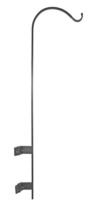Place a decorative hanging item in a unique new location using the Erva Vertical Deck Mount Hanger for 0.4375" to 0.75" Rails. This classically designed hanger sports two innovative clamps at its base, allowing you to hang items from vertical wooden or metal rails with ease. The straight, steel shaft extends 47" upward, and its gentle, top arch extends outward 10.5", for hanging items up to 20" in diameter. The hook curls upward at the end, for a delicate hint, and its black, powder coated finish furthers its classic style. Each bottom clamp is crafted from 0.125" thick, steel plates, with predrilled holes and hardy screws. The opening on each clamp can wrap around a either a square or round, vertical rail between 0.4375" and 0.75" thick, and may also be used on both wooden and metal fencing. The square steel construction of the hanger keeps it durable for many seasons, and the bottom clamps allow you to remove or reposition the unit as needed. Showcase a bird feeder or wind chimes in an exciting new spot with this Vertical Deck Mount Hanger for 0.4375" to 0.75" Rails. Made in the USA.