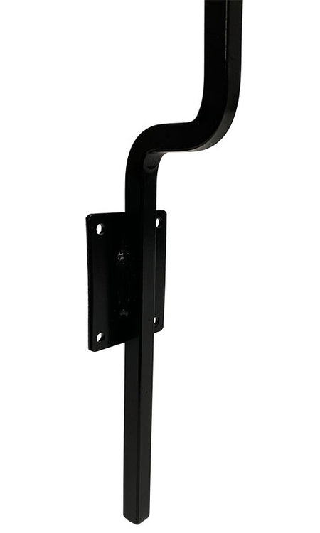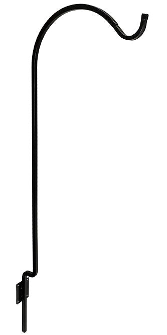 Offer extra wall clearance for showcasing your favorite hanging item with this Erva Black Wrought Iron Offset Wall Hanger. Placing this arched arm against a wall or rail increases the display options in your yard, and its offset design adds clearance for a deck rail or other ridge. A rectangular, 2.5" tall and 2" wide, steel plate with screw holes makes it simple to place this bracket against a post, baluster, or wall with its included, matching hardware. Robust welds connect the wrought iron shaft to this plate, and a 1.25" bend near the base angles the hanger slightly outward for extra deck clearance. Its automotive grade, black powder coating both looks classic for many seasons and protects the bracket from wear, and the unit handily showcases items up to 20" in diameter. Place your favorite hanging accent over your deck rail easily with help from this Black Wrought Iron Offset Wall Hanger. Made in the USA.