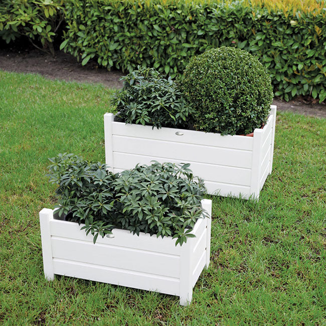 Rustically showcase greenery in your yard or on your deck using these Esschert Aged White Country Folklore Dual Rectangular Planters. The slatted wood construction of these 2 pieces creates a recognizable and charming motif in your yard, while their generous size provides plenty of planting room. Four square posts not only elevate each planter slightly off of the ground; they also support the sides and enhance the rectangular motif. Included, plastic liners help keep soil tidy and in place, while gaps between the bottom slats offer drainage. The low, long shape of each unit is great for lining a path or resting against a wall, and the pieces lend farmhouse style to any setting. The aged white finish contrasts your greenery wonderfully, and the items nest together for easy seasonal storage. Made from wood, these planters remain durable for several seasons, and their shape lends a traditional hint to your yard. Add planting room to your home or deck with these Aged White Country Folklore Dual Rectangular Planters.
