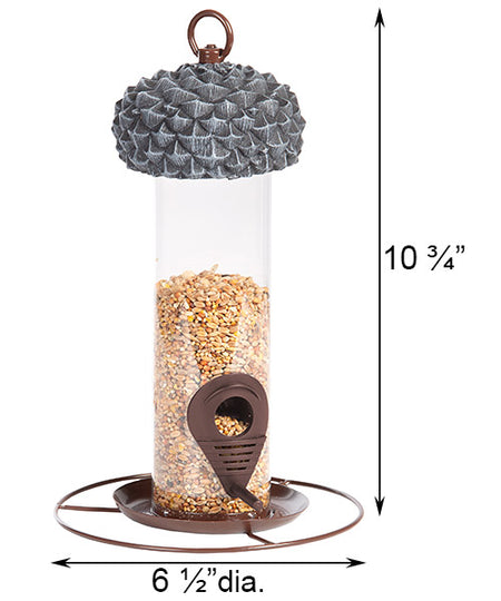 Showcase a variety of natural elements in your bird garden with this Esschert Design Acorn Seed Tube Bird Feeder. The intricate, formed top, traditional reservoir, and large base on this piece perfectly celebrate acorns and oak trees, while adding lovely design to your yard. A clear plastic tube forms the reservoir, easily holding 0.55 quarts of mixed seed. Two reinforced, plastic ports with perches allow birds to access the feed, and a bottom, 6.5" diameter ring offers them additional resting spots. A resin cap with overlapping scales is reminiscent of the top of an acorn, and fully covers the seed tube for protection from the elements. Its gray hues contrast the brown ports, base, and top ring, and its solid construction provides heft to the feeder. Unscrew this top ring and remove the cap to fill the item, or twist the bottom tray off of the tube to completely disassemble and fully clean the piece. Use the top ring to hang this feeder from a branch or bracket, stylishly meshing manmade and natural elements. Bring the motif of seeds to the forefront of your yard with this Acorn Seed Tube Bird Feeder.