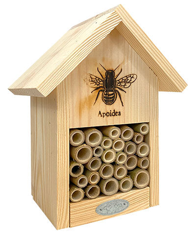 Add an adorable shelter for beneficial bees to your garden with this Esschert Design Basic Solitary Bee House. Many bee species live alone, rather than in a colony, and these mild mannered insects can be welcome garden visitors. Mason, orchard, and horn faced bees commonly nest in holes found on trees or in buildings, and this charming unit provides them a great housing option. The pine frame mimics a traditional shelter, with its rectangular body and pitched roof. The center section of the item holds a wealth of differently sized bamboo tubes, in which a female bee can easily lay her eggs. The roof keeps the eggs protected from rain, while a line drawing of a bee and its Latin family name brings an artistic flair to the piece. A keyhole opening on the home's flat back allows you to attach it to a post, tree, or wall using only a nail. The pine construction ensures a natural look, and will weather perfectly for use for many seasons. Welcome bees into your backyard with this Basic Solitary Bee House.