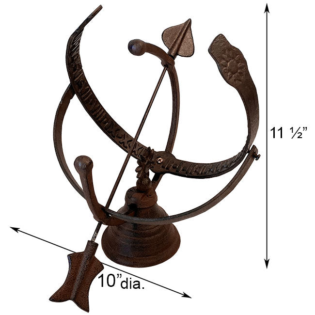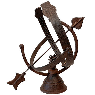 Bring a bit of timeless, heavenly style to your yard with this Esschert Design Cast Iron Armillary Sundial with Sunbursts. Armillary spheres were used centuries ago to map the movement of stars around the earth, while sundials noted the celestial time. This fantastic piece combines the two instruments, and its hardy, cast iron construction creates a lasting garden accent. A 9.5" diameter band has raised Roman numerals around it, and sunburst accents on the exterior of this piece offer a bit of texture and style. This arc affixes to the curved armillary arm, and a three-dimensional sun shape in the center of the base brings a bold look to the unit. Slide the included, 15" long arrow through the upper and lower arcs, which acts as a gnomon for telling the time when the item is oriented celestial north. Black hints throughout the dark brown unit lend it an aged, classic look, while the cast iron construction lasts for many seasons of service. A 4.25" diameter, stepped conical base provides a bit of height, and enables the instrument to be displayed on a pedestal or the ground easily. Brilliantly accent your yard or flowerbed using this Cast Iron Armillary Sundial with Sunbursts. Assembly required.