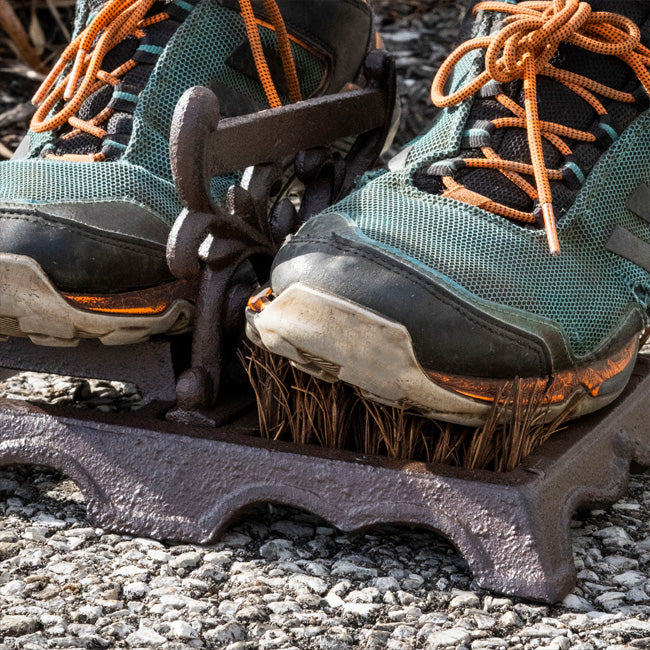 Enhance your entryway with classic style, while helping keep your floors clean, by resting this Esschert Design Cast Iron Boot Brush with Scraper in it. This traditional, hardy piece perfectly sits next to your door, its brown color with black hints enhancing virtually any setting with ease. One half of this unit sports five cast iron slats, creating a spot for you to wipe one foot at a time. Durable bristles occupy the other half of the frame, for eradicating dry dirt from shoes. The raised, center divider provides an additional scraper, and leaf and scroll shapes on it enhance the classic motif. The flared feet form a stable base for this item, and its cast iron construction lasts for many seasons. Lend timeless style to your entry with this Cast Iron Boot Brush with Scraper. Some assembly required.