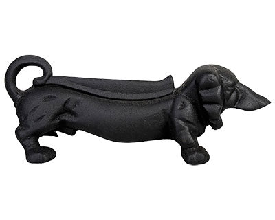 Highlight your love of dogs on your doorstep with the Esschert Design Cast Iron Dachshund Boot Scraper. This adorable figure not only brings a fun look to your front door; it also provides visitors a place to wipe their feet prior to entering. The charming, dachshund shape captures attention in moments, and its familiar, extended body, pointed nose, and low profile offer a bit of realism. A 5.25" long ridge along the back of the dog allows you to clean your shoes easily, and his four generous feet create a stable support. A curled tail furthers the fun look, and the item's black finish blends with any décor. Made from lasting, cast iron, this scraper is sure to be a favorite for many seasons. Place a charming sentry in your entryway with this Cast Iron Dachshund Boot Scraper.