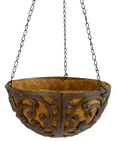 Provide a timeless bed for your favorite flower with this Esschert Design Cast Iron Hanging Basket with Liner. Robust, cast iron slats and intricate scrolls create this basket, and the overall brown tones celebrate nature. The ornate scrollwork adds a traditional, elegant look to the basket and your garden setting, and black hints on the raised sections of the cast iron offer an aged effect. A coco fiber liner rests inside this remarkable frame, and its 9.625" diameter, open center creates plenty of planting area. Soil remains tidy and hydrated thanks to the tightly woven coco liner, and the black color of the attached hanging chains and "S" hook contrast the frame. This hook also makes it easy to suspend the planter from a bracket or branch, and the classic size and shape make a fantastic addition to your garden. Accent your landscaping with graceful scrolls and beautiful tones using this Cast Iron Hanging Basket with Liner.