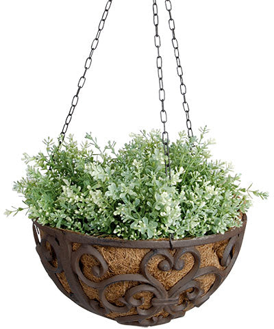 Place your favorite flower and elegant design sensibility on display in your yard with this Esschert Design Cast Iron Hanging Basket with Liner. The traditional design and cast iron construction create a robust basket, furthered by its deep brown tone with black accents. Connected, swirling scroll shapes between flat slats form the bespoke motif, and an included coco fiber liner completes the item. This tightly woven liner nestles perfectly in the frame, and wonderfully holds both soil and plants. The 11.375" diameter, open top and tapered body provide a good amount of room for a flower or herbs, while three, 18" long, black metal chains attach to the top edge. A significant "S" hook holds these chains, allowing you to place the planter on a bracket or hanger in moments. The black finish on this hanging assembly enhances the black hints on the basket, and the cast iron build lasts for many seasons. Make flowers into a stylish focal point in your yard using this Cast Iron Hanging Basket with Liner.