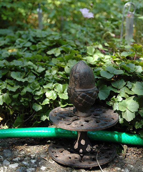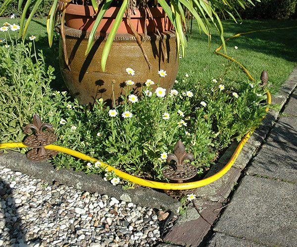 Prevent your garden hose from running through your landscaping using these Esschert Design Cast Iron Hose Guides. These 3, ornate units insert with ease into your garden soil, and their classic top accents offer elegance and timeless style. The pieces all have a 6.875" long stake with pointed end, inserting easily into garden soil, topped by dual, 3.75" diameter discs. An hourglass shaped, cast iron divider forms a gap between these discs, handily directing your garden hose and keeping it away from delicate flowers. Two of the guides have slightly different fleur-de-lis finials, while the third has an acorn shape to enhance the outdoors. The deep brown color and black accents on the units further their aged effect, and the sturdy, cast iron construction offers durability. Protect your favorite flowers or herbs from your garden hose with these Cast Iron Hose Guides.