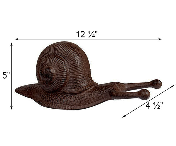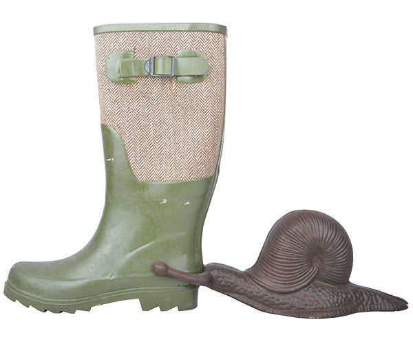 Carefully and cleanly take muddy or wet shoes off of your feet with this Esschert Design Cast Iron Snail Boot Puller. Resting this charming figure near your doorway wonderfully suggests visitors remove shoes before entering your home, aiding in keeping your floors tidy. A tall, spiraling shell sports impressed lines for definition, while the flared and textured base makes it simple to rest the piece on a level surface. Two extended, front antennae have a 2.75" wide gap between them, great for gripping the back of a shoe, and the lengthy tail flattens for placing your other foot on it. Black hints on the textured body add definition and enhance the overall brown hue, and the cast iron construction provides durability. Place an adorable shoe assistant at your doorway with this Cast Iron Snail Boot Puller.