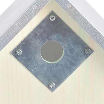 Keep the entry hole on your existing wren house small with this Esschert Design Metal Hole Protector. This sturdy, square steel plate easily affixes to a wooden bird house, and its center, 1" diameter opening provides passage only to small songbirds. The galvanized steel handily prevents other birds from enlarging the entry, and a predrilled hole in each corner of the plate makes installation simple. Keep your chickadee or wren house protected from woodpeckers or squirrels with this Metal Hole Protector.