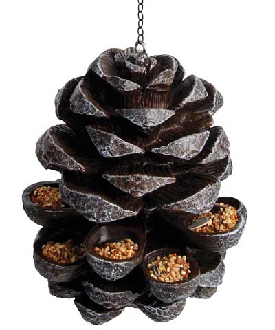 Offer bird seed to your feathered friends in an adorable, evergreen way using this Esschert Design Pinecone Hanging Bird Feeder. This realistic pinecone figure lends adorable style to your bird garden, and its brown and black finish offers plenty of dimension. White hints on the textured edges evoke frost and help define the item, and the layered scales and tapered body shape complete the effect. Two rows of scales each have 1.5" diameter depressions within them, these 10 bowls handily accommodating bird seed, fruit, mealworms, or suet nuggets to feed a variety of birds. A top, metal chain makes it simple to hang the feeder from a bracket, and the resin construction remains durable for use again and again. The piece works well as a seed catcher when hung below another feeder, or acts as fantastic winter holiday décor. Celebrate mighty evergreens in your backyard using this Pinecone Hanging Bird Feeder.