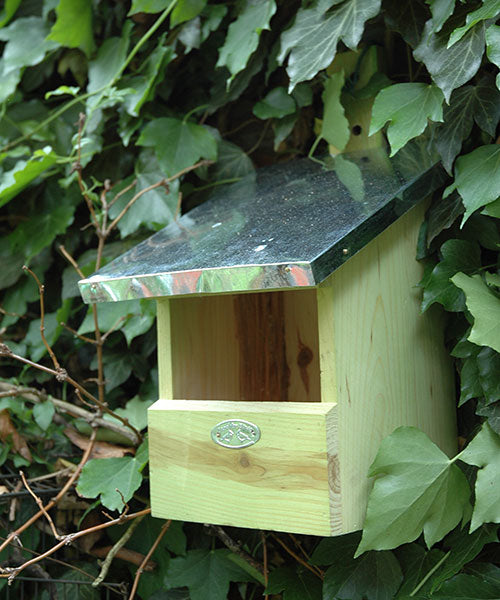 Offer specific birds a new and lovely roosting spot by adding this Esschert Design Robin Nesting Box to your yard. Phoebes, robins, and barn swallows often prefer to build nests on platforms, rather than in an enclosed house, and this unit provides them plenty of room to do so. The significant, 4.75" wide and 2.75" tall opening allows the birds to easily access the center chamber, and its flat base and extended sides create plenty of nesting area. The all wood construction adds a natural hint to the shelter, enhanced by its slight green tone, and the roof of the item slopes downward to protect the interior from the elements. The gray, metal covering on the roof contrasts the wooden body for style, and helps the home remain durable. An extended back tab with predrilled holes makes it easy to place this nest box against a post, wall, or tree in moments, or a mounting plate (not included) can be affixed to the flat base for placement on a pole. Invite robins to roost in your area with this Robin Nesting Box.