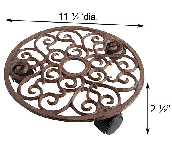 Bring height and drama to your favorite potted plant with the Esschert Design Round Plant Caddy. Placing your flower on a caddy or trivet quickly elevates it from the ground, providing more air circulation around the roots and better water drainage. This circular unit adds a traditional look to your backyard or deck, enhanced by its aged brown color and cast iron construction. A scrolled pattern creates the base, for an elegant touch indoors or out. The item easily holds pots with a 10.5" or smaller base diameter, and the three attached plastic casters allow you to perfectly position your plant. Two of these casters lock into place, preventing unwanted movement. Display your favorite potted flower with help from this Round Plant Caddy.