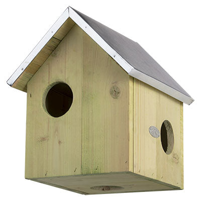 Enjoy watching squirrels create a nest in the Esschert Design Squirrel House. Adding a squirrel house to your backyard will certainly bring a lively and unexpected element to it. This wooden roost provides squirrels a generous nesting site or hiding place, particularly for the winter months or birthing season. Three 2.25" diameter entry holes allow squirrels easy access to the unit, and the hole on the base provides them a secure and quick exit. One side of this home latches closed, and lifts upward for nest checks or cleaning. The 0.5" thick, wooden construction ensures the unit remains insulated, aided by its pitched roof. Silver colored metal covers this roof for dimension, and contrasts the green hue of the shelter. A keyhole opening at the back of the item enables you to attach it to a tree or post easily. Add an amusing home to your backyard with this Squirrel House.