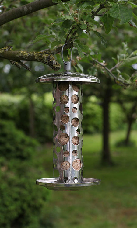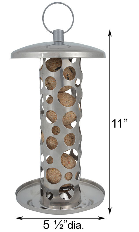 Feed birds with a modern twist using this Esschert Design Stainless Steel Suet Ball Feeder. The reflective finish on this narrow column adds a sleek look to your bird garden, furthered by the varied, circular cut outs throughout this reservoir. A 5.5" diameter roof and tray support this tube easily, allowing you to place up to 4 suet balls in it. Adding suet to your yard not only invites different bird species to dine; it can also diminish seed waste and debris for a tidy sanctuary. This unit is specifically designed for 2.5" diameter or smaller suet spheres, protected from the elements by its slightly domed lid. A slight lip on the base creates perching spots for birds, while holes here provide drainage. A top loop makes hanging this unit simple, and the lid twists off of the base for cleaning and refilling. Made from stainless steel, this innovative feeder will remain durable for many seasons, and its silver tone adds a bold effect. Offer a variety of birds a new feeding option with this Stainless Steel Suet Ball Feeder.