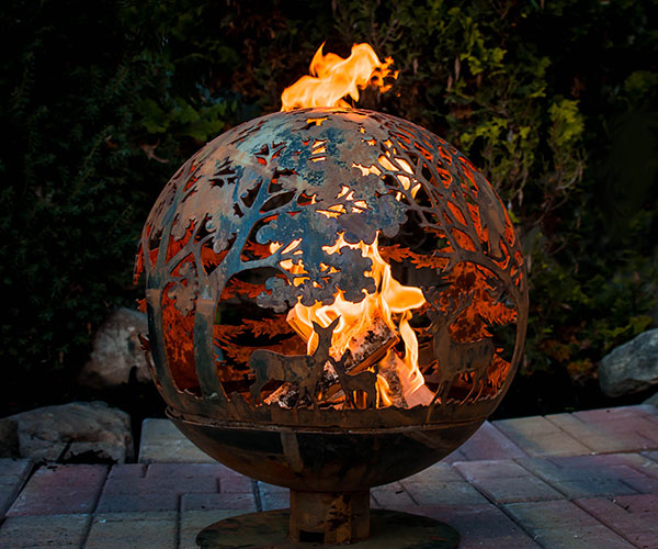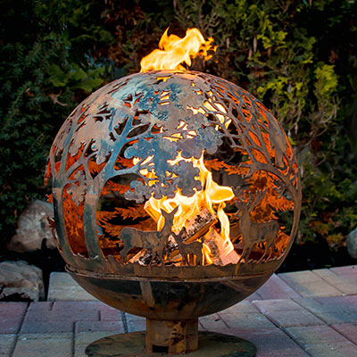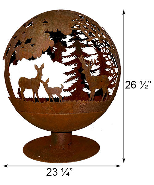 Add remarkable style and an amazing gathering spot to your patio with this Esschert Design Large Steel Wildlife Fire Sphere. The intricate, laser cut designs on this unique piece will certainly capture attention, while its spherical shape provides height. Deer, owl, and rabbit silhouettes against a wealth of tree figures forms a recognizable, sylvan scene on the unit, furthered by the rusted finish. A 15.75" diameter, steel base handily rests on a level surface, and expands to 18.25" to hold your fire logs with ease. Place the top section of this sphere on the edge of this bowl, partially encasing the fire and creating striking shadows in your yard. Wider openings on two sides of the orb allow you to easily add logs to your fire, and the supportive base wonderfully elevates the piece. A hole on the bottom of the basin enables air to circulate around your logs for an even burn, and makes it easy for any water to drain. The reddish tan tone of the rusted finish highlights your fire, and the steel construction forms a durable accent. Celebrate the untamed beauty of nature in your yard with this Large Steel Wildlife Fire Sphere. Some assembly required.