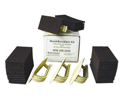 The Firestone Quick Scrubber Kit includes 30 scrub pads and 4 holders that allow the installer to apply QuickPrime Plus when seaming two sections of PondGard EPDM liner. Attach the pads to the holder quickly and easily using the small securing hooks on the bottom of the holder. Made in the USA.