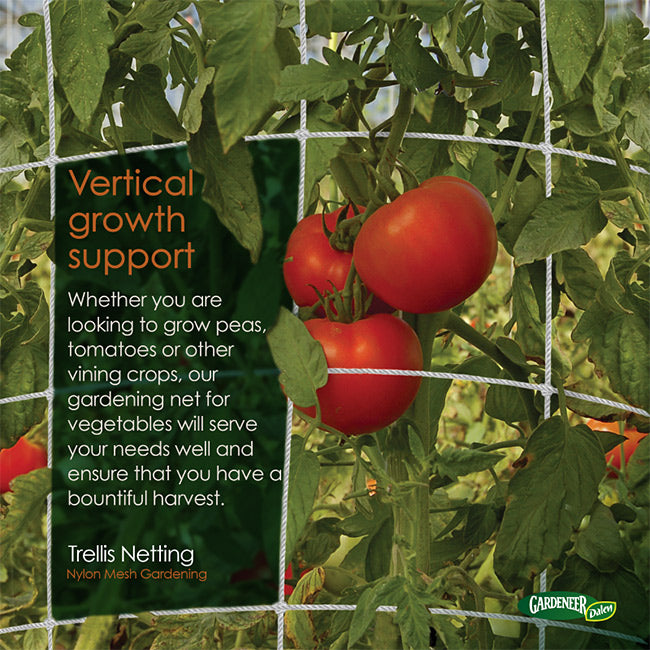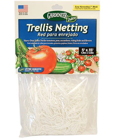 Make growing your favorite vine fruits and climbing flowers a snap with Gardeneer Vegetable Trellis Netting. This is a permanent nylon mesh with a 60 pound breaking point for supporting heavy crop loads. The 7" mesh softly protects your crop while allowing ample room to reach through for harvesting. Conserve space by growing your garden vertically with Gardeneer Vegetable Trellis Netting. Made in the USA. Lifetime warranty.