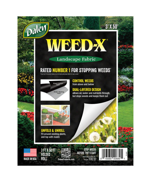 Stop weeds before they take over your garden with Gardeneer Weed-X Landscape Fabric. This porous, heavy-duty, sun-blocking fabric allows air, water, and nutrients to reach your garden and plants while also protecting against aggressive weeds. Unfold and unroll the fabric to cover your chosen area while cutting holes, if desired, for new or existing plants to grow. This 3' x 50' folded fabric roll can easily be cut or transported to help cover virtually any location necessary to eliminate the spread of weeds. Once in place, secure the fabric with garden staples and top with mulch. Maintain your beautiful landscaping with this Weed-X Landscape Fabric. Made in the USA.