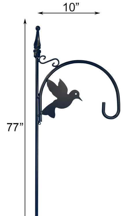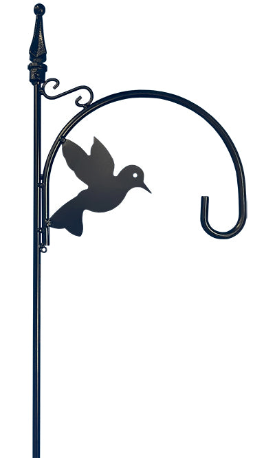 Update your garden with a new hanging item and a lasting, avian motif by placing this Gardman Black Bird Accent Shepherd Hook in it. This classic, all steel hanger adds fresh style and bolsters the theme of your bird garden, thanks to a flat, metal bird figure resting beneath the hook. A finial at the top of this hanger adds a finished look and a bit of height, while the all black color offsets garden greenery, and a small scroll between the hook and shaft completes this item. The tall arch and inward curl make hanging your favorite bird feeder or lantern simple, and the piece holds an item up to 19" in diameter with ease. Made from sturdy steel, this hook will certainly withstand use for several seasons, and a 10" step-in base keeps it stable within the lawn. Encourage birds to flock to your yard by hanging a feeder on this Black Bird Accent Shepherd Hook.