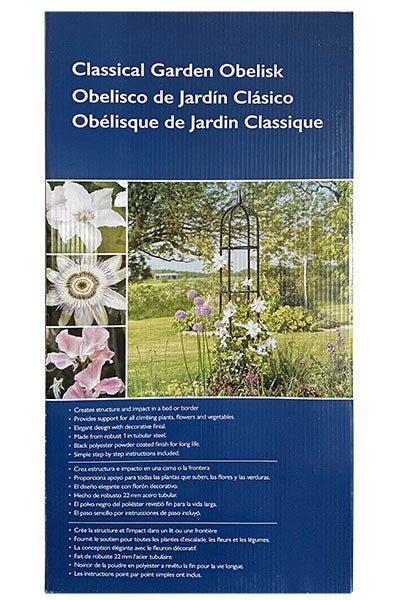 Bring vertical style and traditional support to your garden bed with this Gardman Black Classic Garden Obelisk by Harbor Garden. Placing this structure directly above a young vine or shrub provides tendrils several gripping options, assisting upward growth and decreasing stress on the roots. The four, tubular steel legs form a solid frame, intersected by three horizontal, 15.5" diameter rings for style and support. The legs culminate in a gentle arch, while a plastic finial here provides height. Wrap tendrils around the 0.875" diameter, tubular steel legs and rings to lessen root strain and create a unique effect in your yard. The black tone of the polyester powder coating adds a timeless look to your landscaping, while remaining durable and weather resistant for several seasons. Showcase height and vertical growth in your garden or flowerbed with this Black Classic Garden Obelisk. Assembly required.